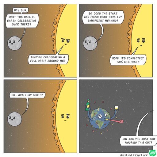 This is a bit disingenuous; what’s considered the “new year” is usually aligned with the seasons and the passing of winter, which is very much not arbitrary and completely dependent on the tilt of Earth’s axis.