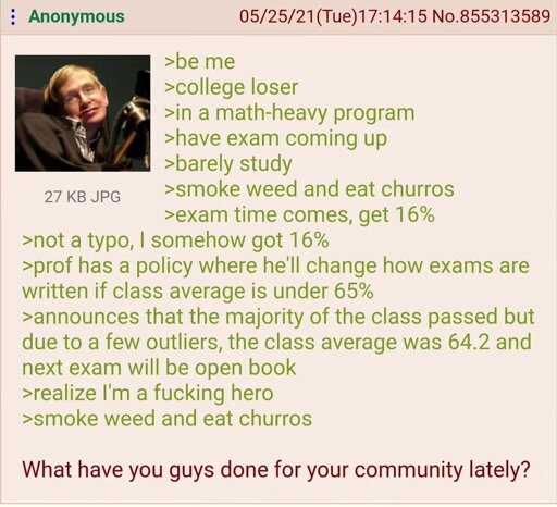 Got 4% on my first (and only) calc midterm. I statistically should have gotten a better grade by randomly picking multiple choice questions and leaving everything else blank… Sadly it didn’t provide anything to the rest of my class and I had actually studied for it.