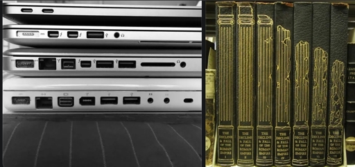 USB-A, FireWire and that video output converged to Thunderbolt, which also means I can connect several displays to e.g. a 2021 MacBook Pro. The separate headphones and microphone jacks got merged as well. After the whole Touch Bar brouhaha, the card reader and HDMI also made their return.