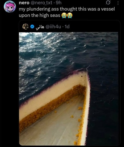 minus-squareSquirrelanna@lemmy.blahaj.zonelinkfedilinkarrow-up14·7 months agoBlueberry cheese cake lmao. The “water” is the top blueberry layer and the “boat” is where a slice was cut out.