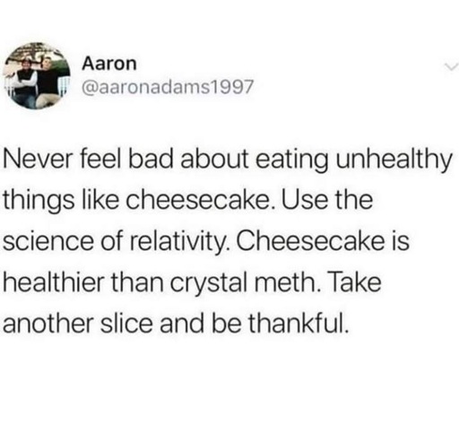“Never feel bad about eating unhealthy things like cheesecake. Use the science of relativity. Cheesecake is healthier than crystal meth. Take another slice and be thankful.”