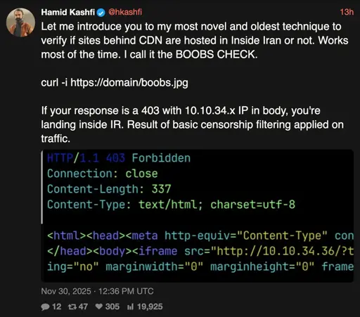 “Oh boobs.jpg just gives a 404, can’t be in Iran!” (When the server is in Iran)