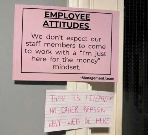 To add, I think theres a difference between ‘im here to work in exchange for money’ and ‘im just here for 8 hrs to collect a check’