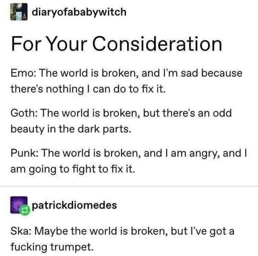 Re: the ska quote - There’s a sticker at a venue here with Batman pimp slapping Robin as he says this that I think about a lot.