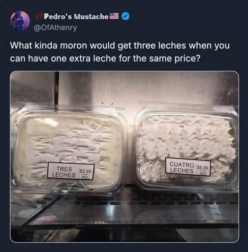 minus-squareIced Raktajino@startrek.websitelinkfedilinkarrow-up32·2 months agoThe “Cuatro Leches” is like the jackasses on The Price is Right who, seeing you’ve bid $500, bids $501.
