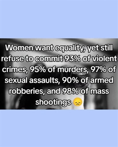 We don’t know the actual statistics of what percentage of violent crimes and sexual assaults are committed by women. A lot of woman on man crime (domestic abuse, sexual assault) largely goes unreported when it happens, and hardly ever gets taken seriously when it does.